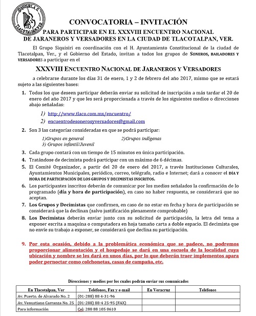 El Grupo Siquisirí en coordinación con la Secretaria de Turismo del Estado, el Instituto Veracruzano de Cultura, Culturas Populares, Conaculta y el H. Ayuntamiento Constitucional de la ciudad de Tlacotalpan, Ver. invitan a todos los grupos de Soneros, bailadores y versadores a participar en el