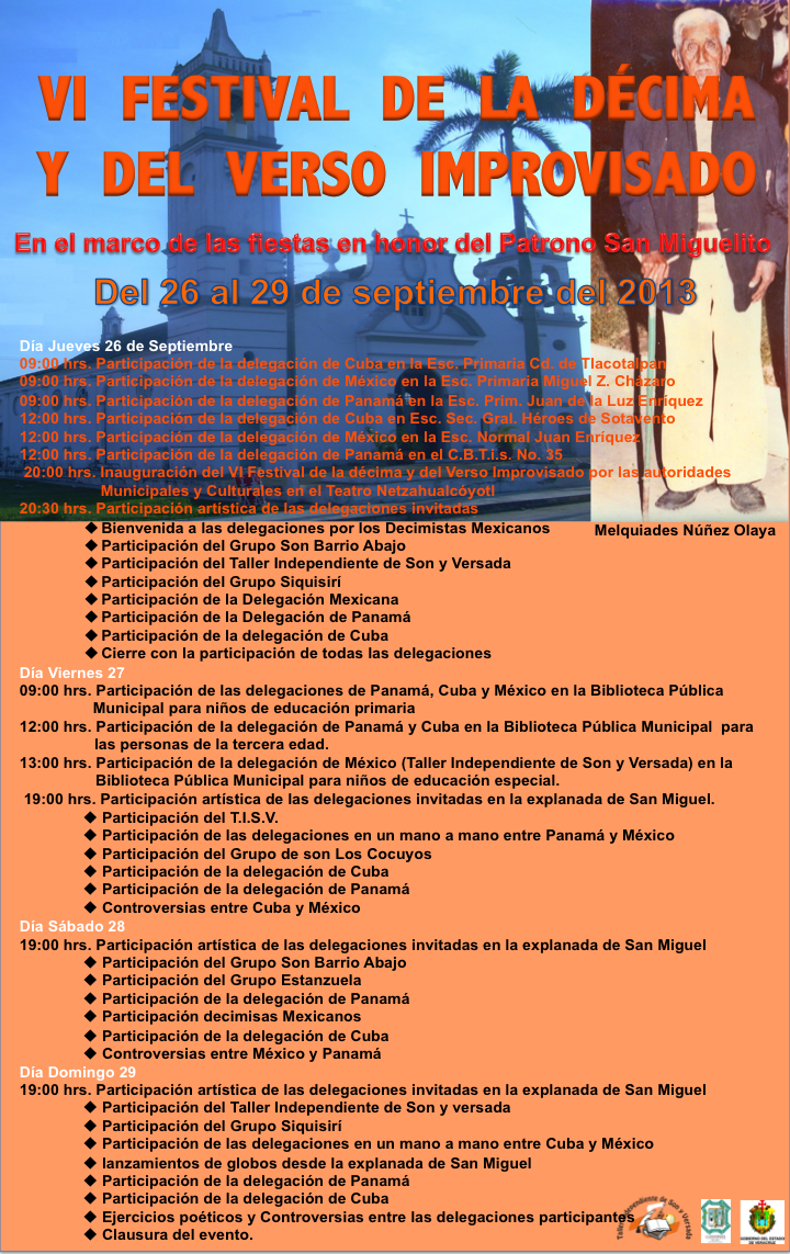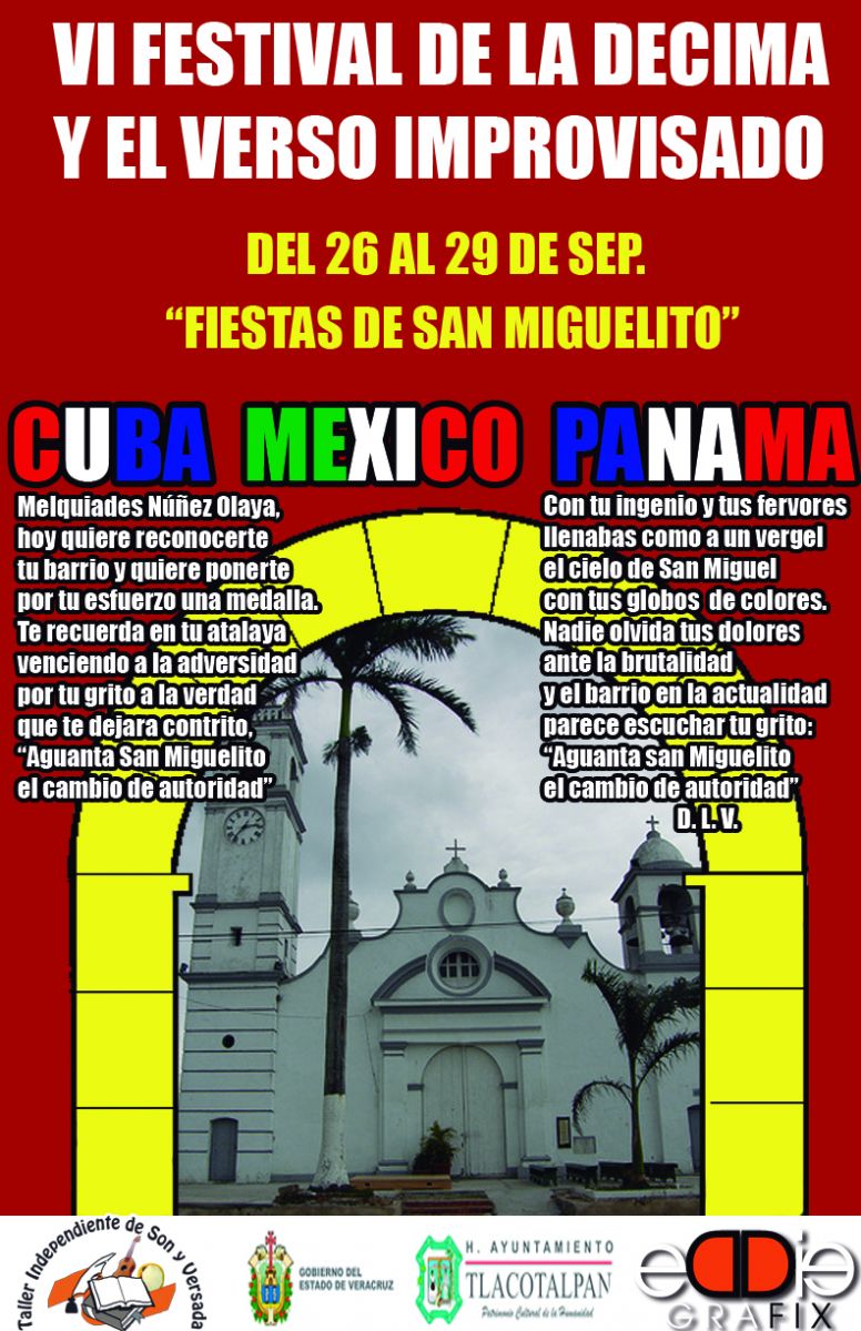 Del 26 al 29 de Septiembre del 2013, en el marco de las festividades de nuestro patrono San Miguelito, como le conocemos en nuestra tierra Tlacotalpan, Veracruz, México, realizaremos el VI Festival de la Décima y del Verso improvisado con la participación de los países de Cuba, Panamá, y el anfitrión México. Esperamos nos puedan acompañar y disfrutar de esta estrofa poética interpretada en sus diferentes formas, acompañamientos musicales, como el Punto Cubano, las tonadas panameñas con la famosa saloma, en México su interpretación en esta ocasión con el son jarocho, en fin les dejamos la programación corregida y aumentada.